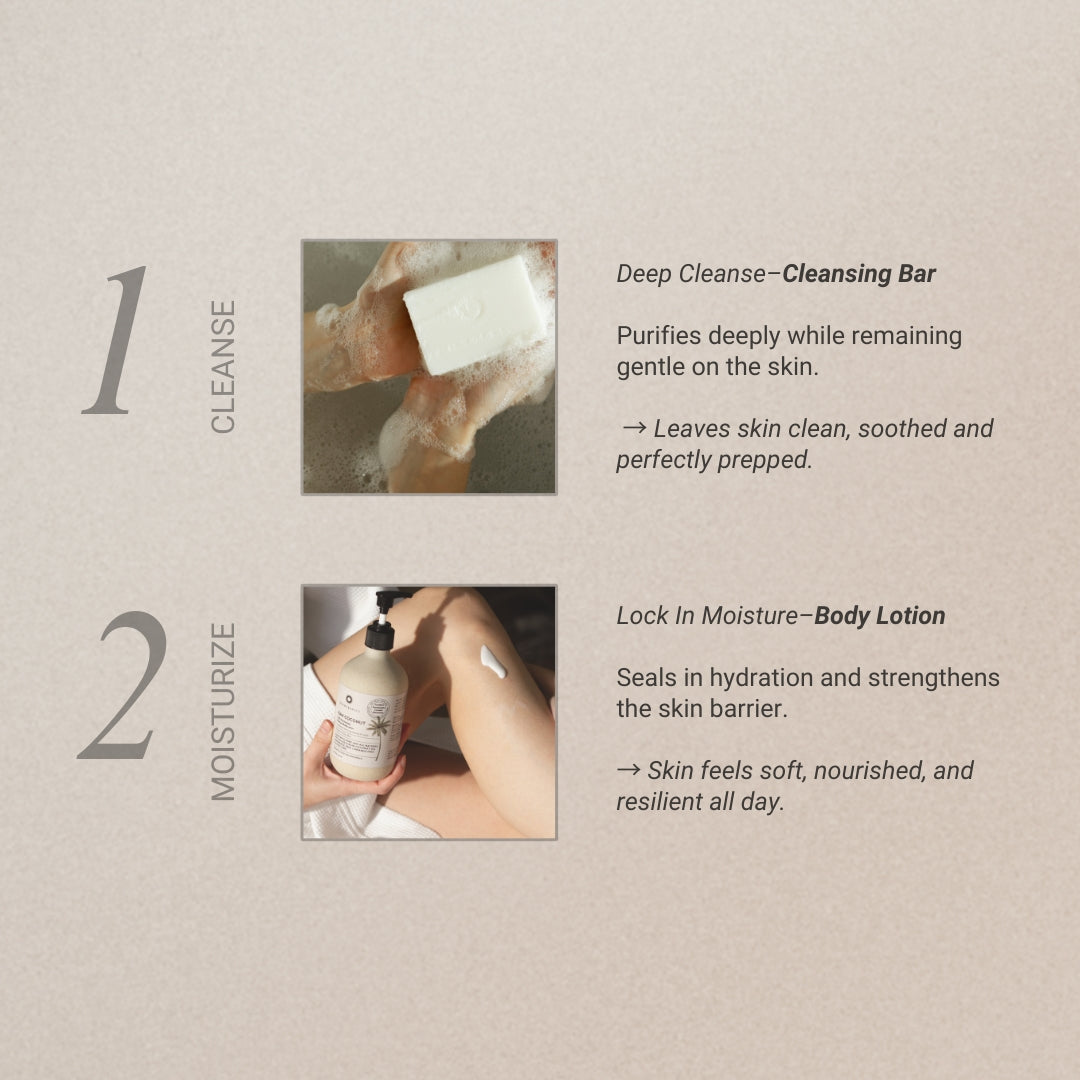 Our bundle features a Gentle Cleansing Bar and Lotion, specially formulated to work in synergy, restoring your skin to its smoothest.